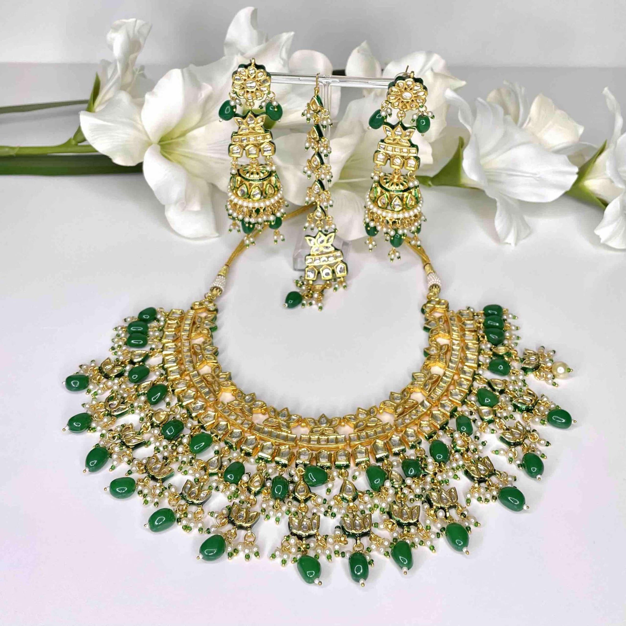 This Kundan set is perfect for brides seeking a classic look. Comprised of high-quality Kundan gold and white metals, it is sure to add a timeless elegance to your wedding day. The Bottle Green and Gold colors of this set are perfectly balanced to provide a sophisticated and unique look.