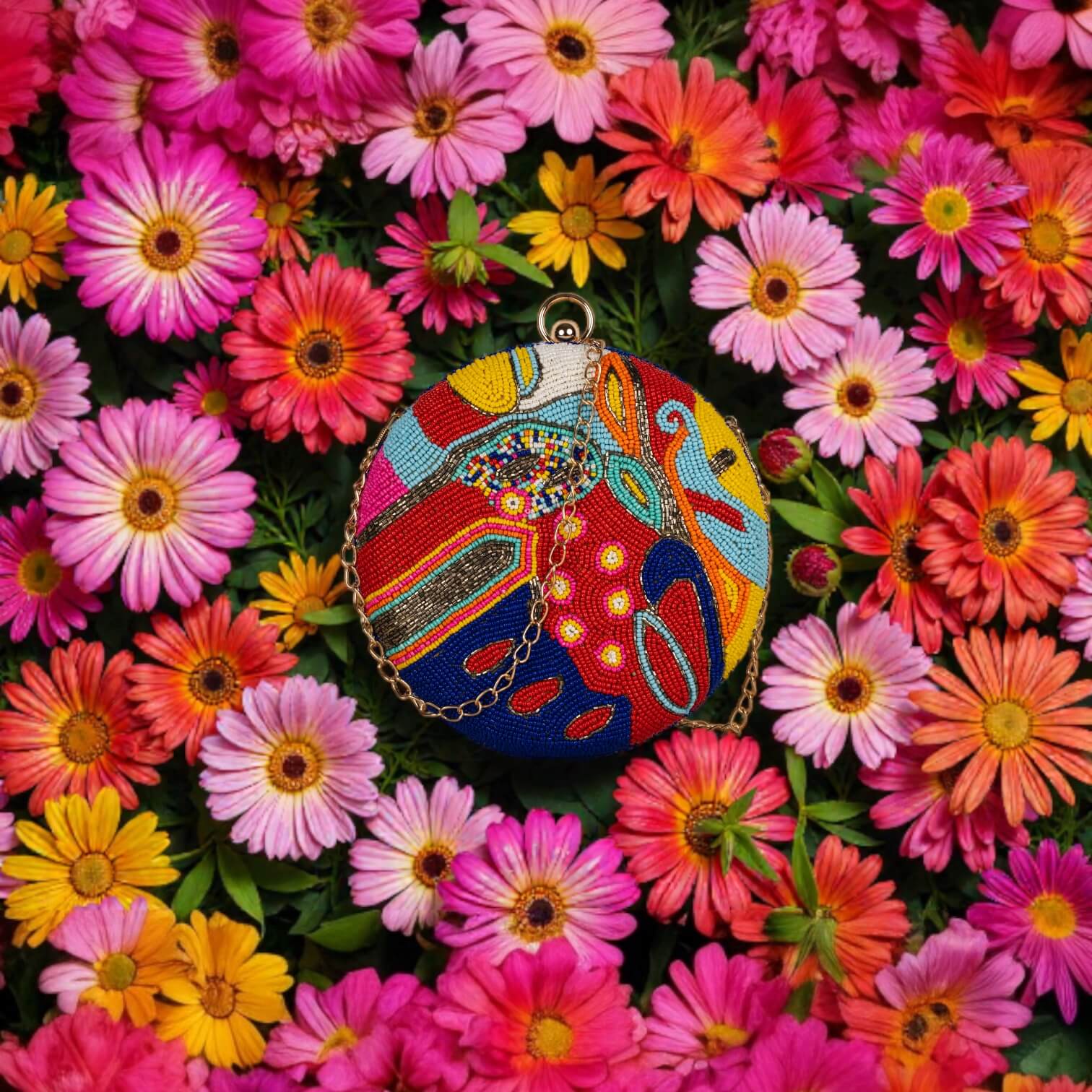 A bold round clutch with vibrant bead embroidery and an artistic multicolor design. A true statement piece that brings color, character, and Indo-fusion flair to any festive or party look.