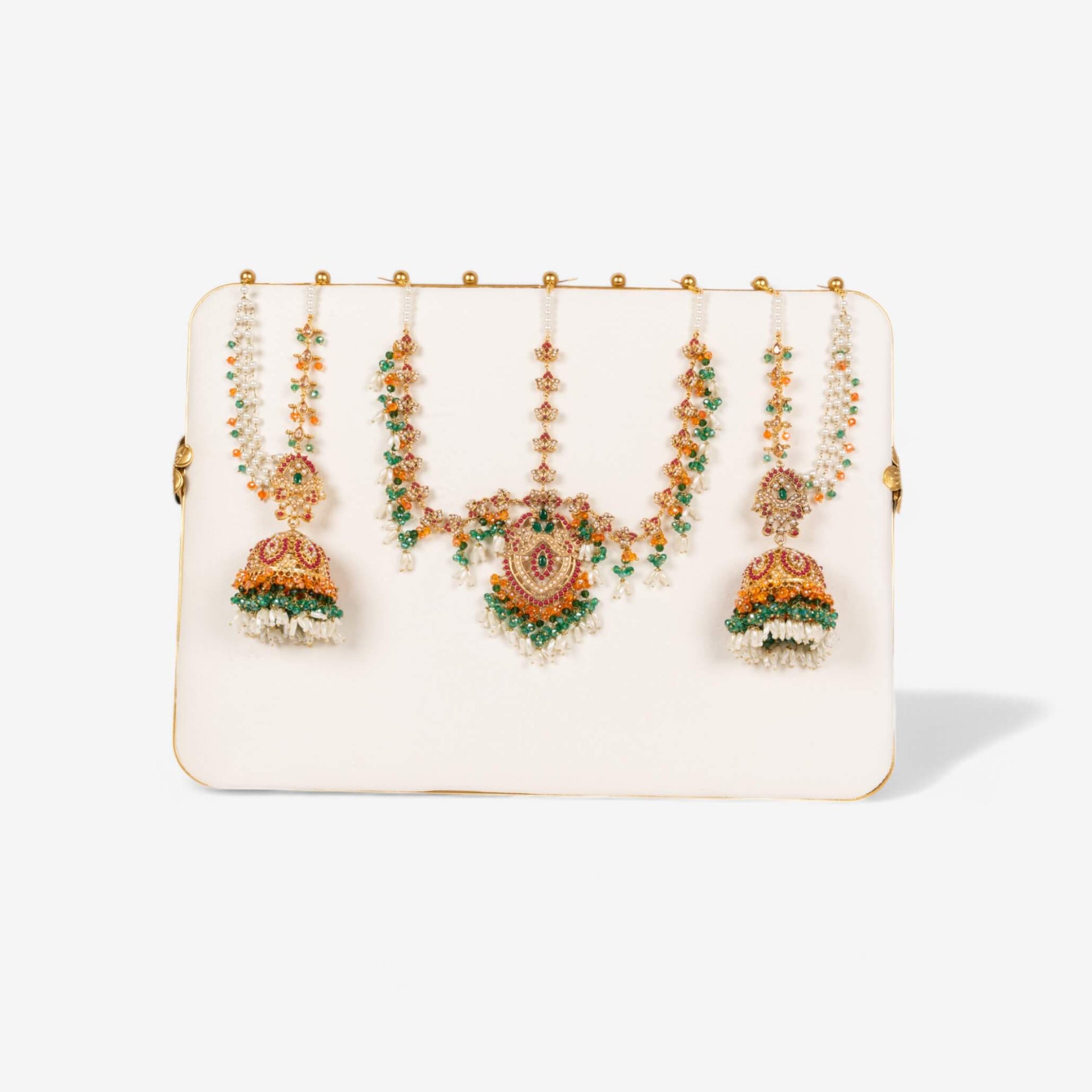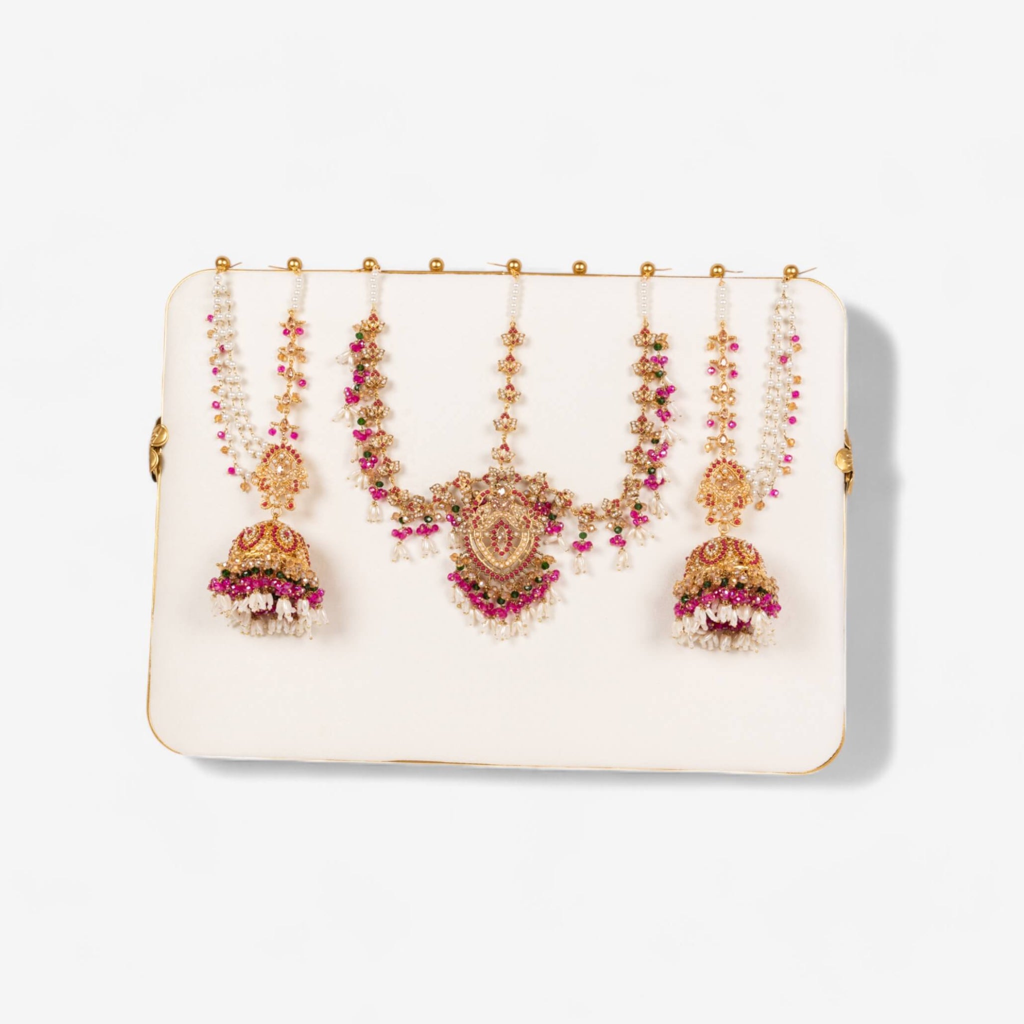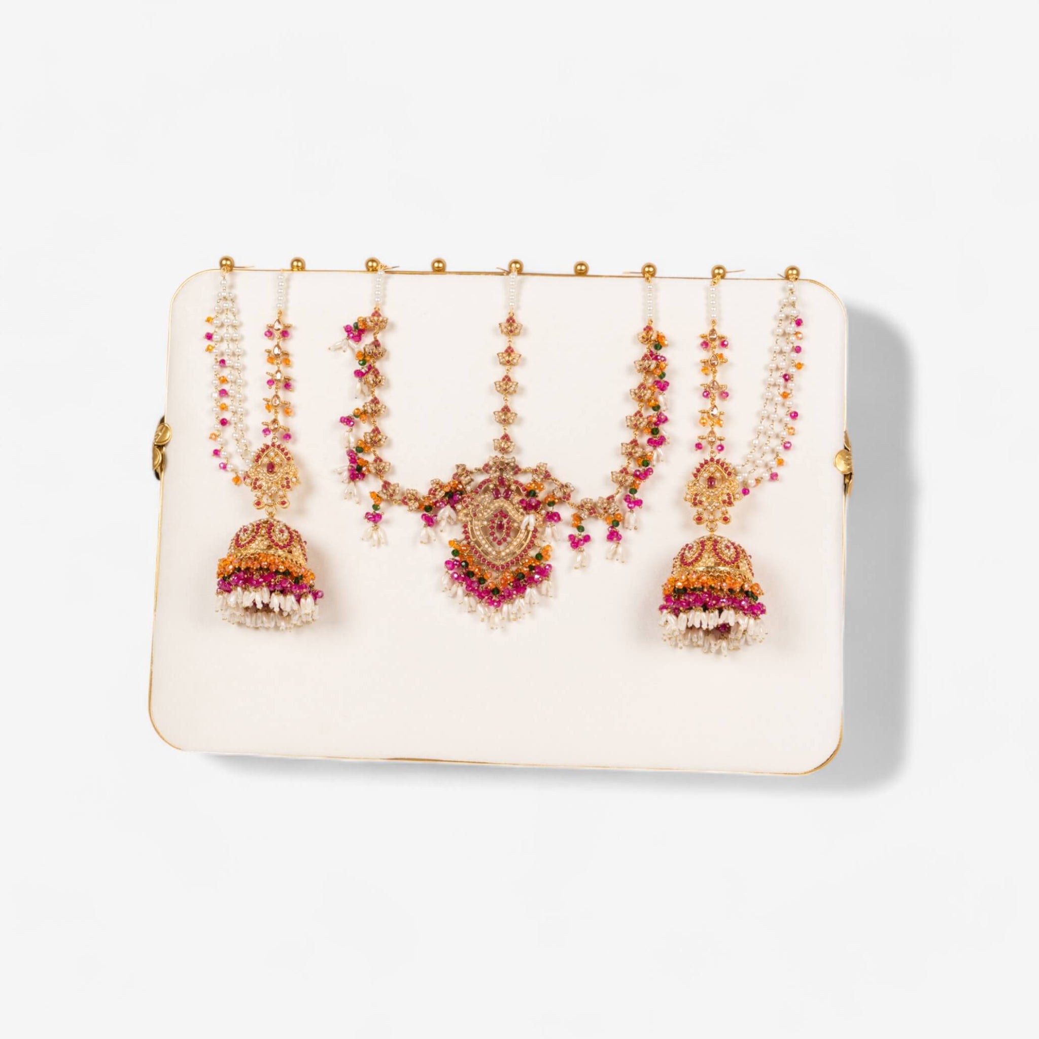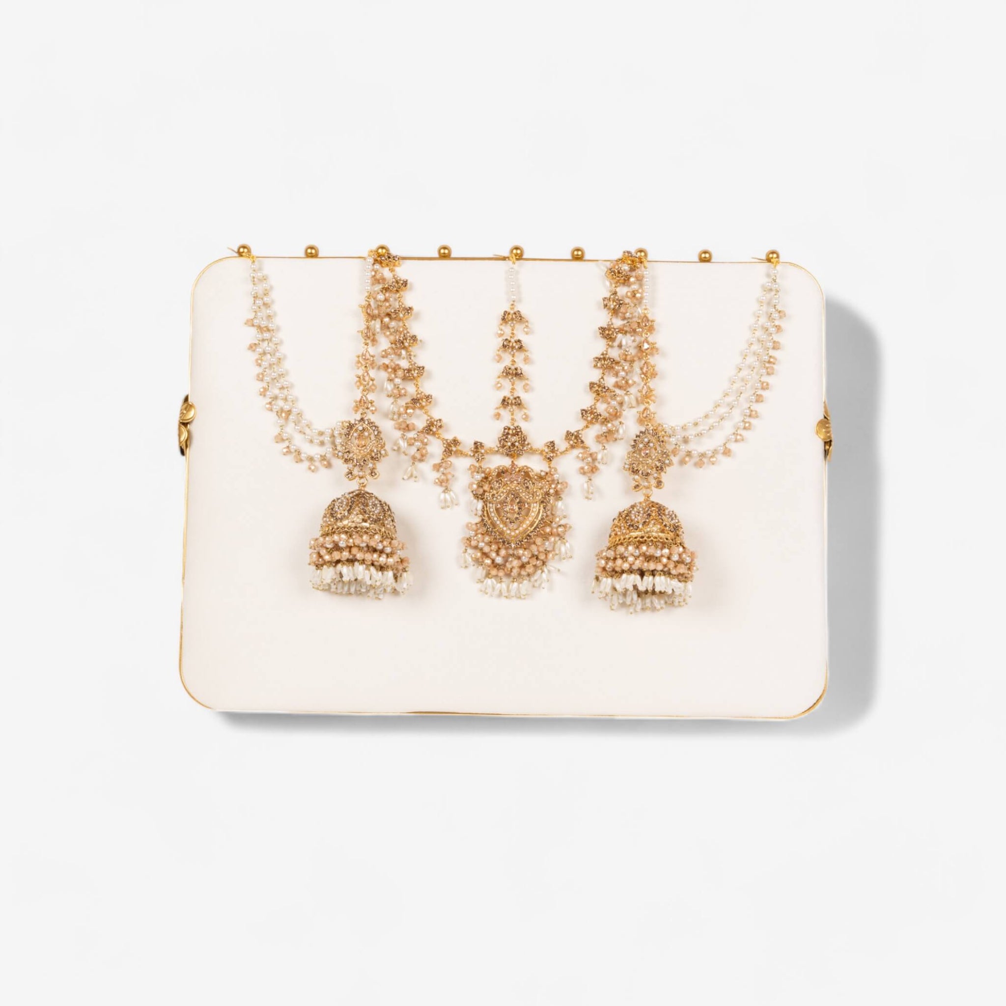 Introducing our Veer Mathapathi Set, our best-selling earrings now come with a beautiful mathapathi design. Embrace both modern and traditional luxury with this must-have accessory. Elevate any outfit with this versatile and stylish set.